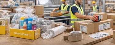Prozessablauf - Der Verpackungsprozess umfasst alle sorgfältig ausgeführten Arbeitsschritte: das fachgerechte Aufrichten des Kartons, das präzise Einlegen der Ware, das Hinzufügen von geeignetem Füll- und Polstermaterial, das sichere Verschließen der Verpackung sowie das professionelle Anbringen der Versandetiketten.